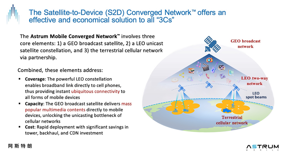 Astrum owns the exclusive 25 MHz contiguous L-band, the best mobile spectrum for satellite mobile delivery over the Asia-Pacific that could connect to the 4.6B population, and the in-orbit geostationary (GEO) broadcast satellite AsiaStar with turnkey multimedia service ecosystem support, which together form the largest operating mobile data distribution platform in Asia.